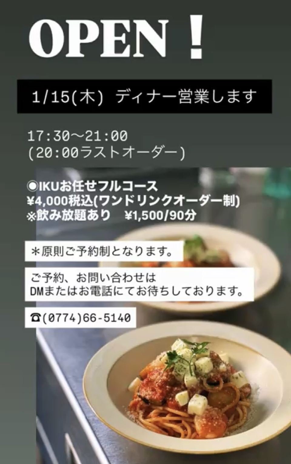 1/15(木)はディナー営業いたします。※原則ご予約制となります。