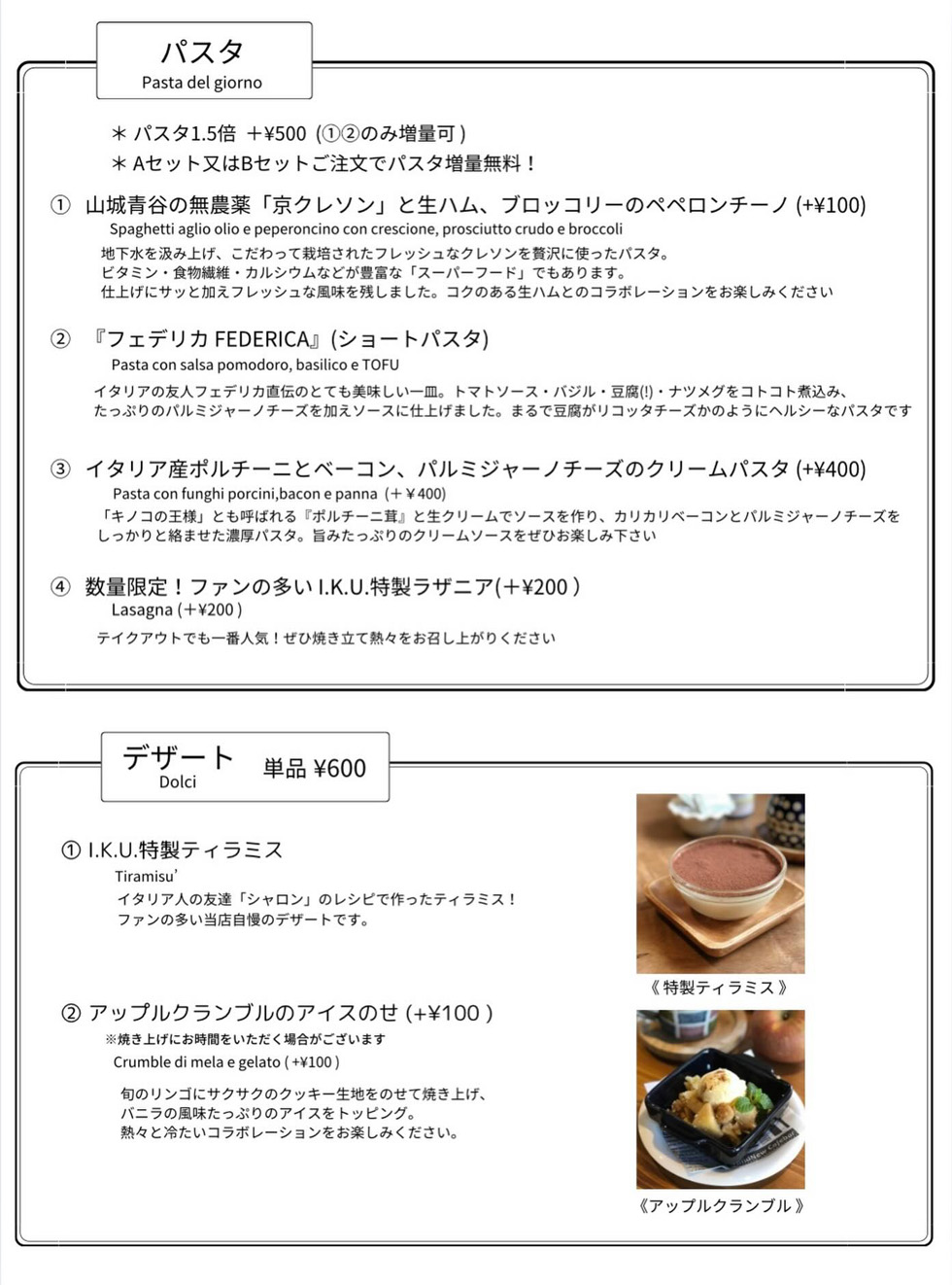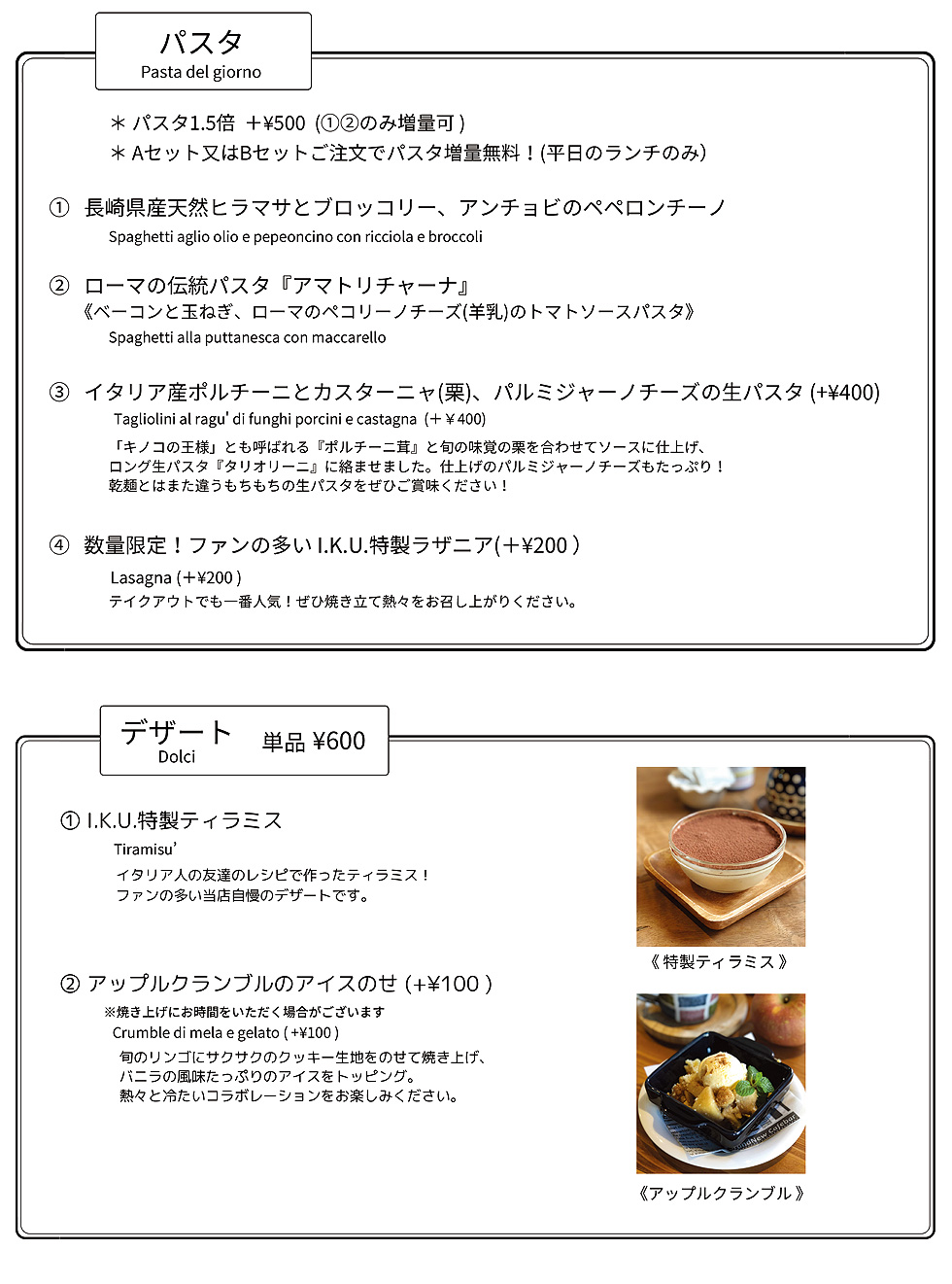 店名の『La Cucina di I.K.U.(ラ クチーナ ディ イク)』はイタリア語で『イクの台所』という意味です。
